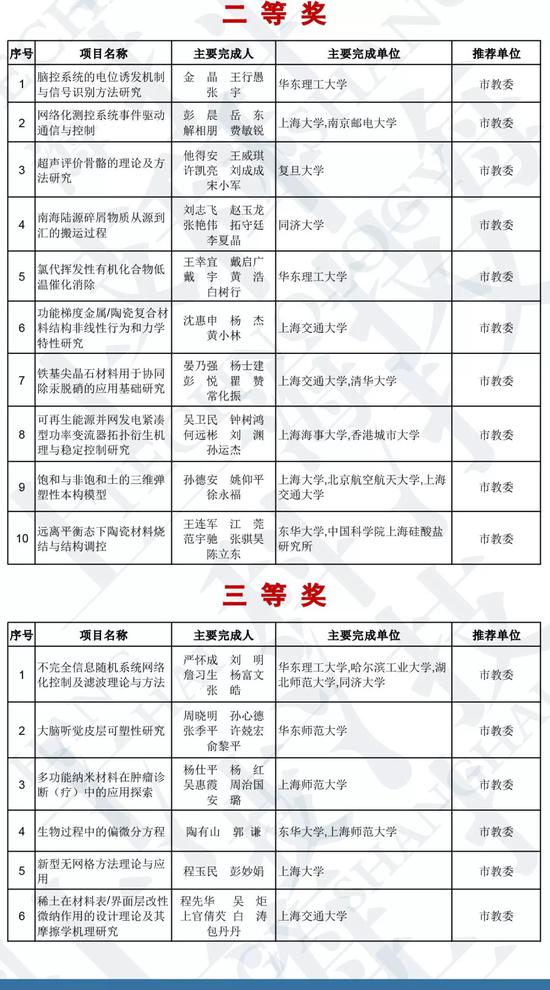 3、授予28项成果上海市自然科学奖,其中一等奖12项、二等奖10项、三等奖6项;